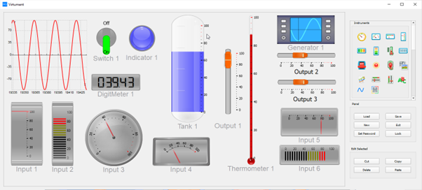 Analog Gauge — Radial meters for voltage, temperature, pressure, etc.Digital Display — 7-segment or LCD-style numeric readouts.XY Plot / Oscilloscope Widget — Real-time waveform visualization with zoom/pan.Spectrum Analyzer Widget — FFT magnitude plots (leveraging CUDA/OpenCL via ArrayFire).Thermometer, Level Indicator, Bar GraphKnob / Rotary Encoder Widget — For setpoint or gain adjustment.Slider / Trackbar — Analog control (e.g., duty cycle, frequency).Push Button / Toggle Switch / LED Indicator — Digital I/O simulation and control.Waveform Generator Widget — Select sine, square, sawtooth, chirp with real-time parameter tuning.